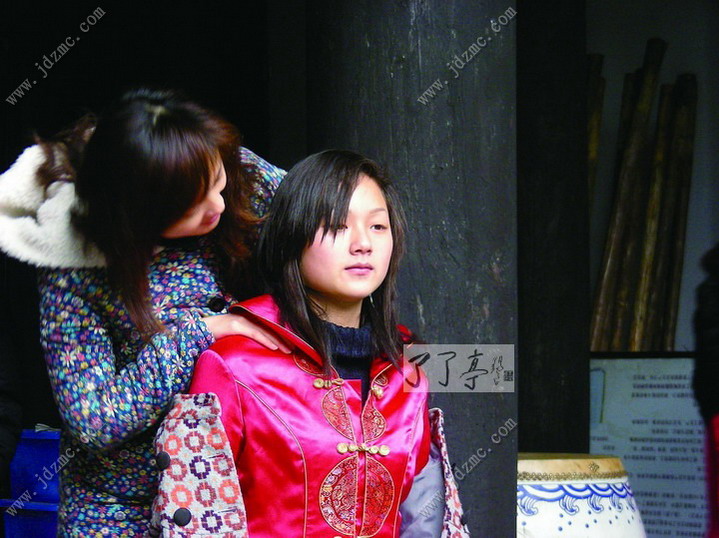 拉二胡的是一位景德镇市瓷乐团年轻的姑娘,刚演出完还没来得及换下演出的红色长裙,便坐在天井的另一侧,摆上乐谱练习了。忽然,后堂传来一阵清脆的笑声,三四个女孩边换妆边打闹,她们也都是瓷乐团的团员,刚排练完换上更暖和的冬衣。