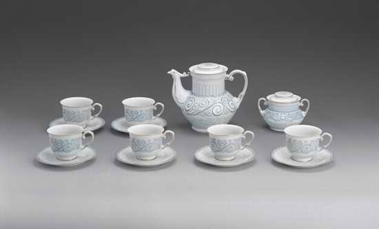 此套茶具模拟凤凰的形态,将壶身塑造成一只约跃跃欲飞的凤凰。壶嘴、壶把拟为凤凰之首尾,纹饰亦与之相配,釉下蓝绿彩,明艳而神秘,更增器物之华贵雍容之气。
