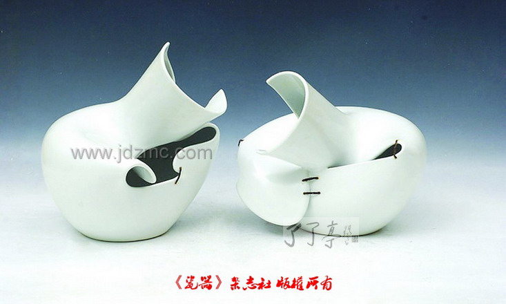 80后的郝志雷就曾创作过这样一组陶艺作品,白色的瓷质天球瓶或葫芦瓶,不但外形歪瓜裂枣得离谱,瓶体还被扒拉出一道触目惊心的口子,然后再被打上N个刺眼的补丁。
