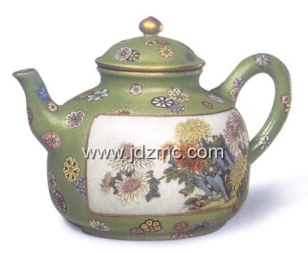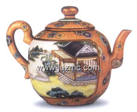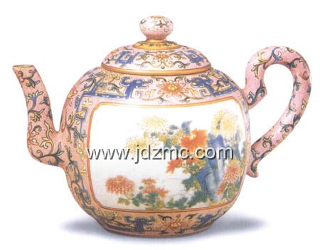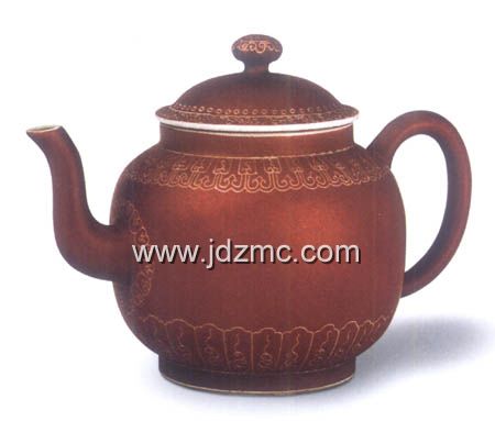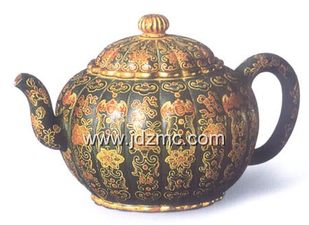 以上这些茶具以壶器形繁多,有扁平形、高桩端把式、提梁式、竹节式、石榴式、佛手式、桃形倒流式、人形、鸟形及做成福、禄、寿、喜字形的;另外还有菊瓣式、瓜式、梨式、莲子、方体和直流式等茶壶。清宫还藏有大量的紫砂壶,其装饰手法非常讲究,有画珐琅、描金、炉均、雕漆、包漆、色泥堆绘等,造型有扁圆、瓜棱、包袱、树瘿、菊瓣、莲瓣、竹节、桃式等。