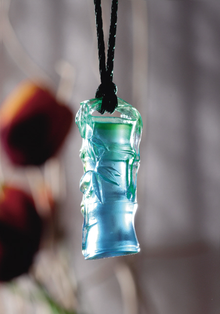 “赤忱同此心”(图1) 原著第二十九回,写情投意合的贾宝玉林黛玉发生情感误会:“看来两个人原本是一个心,但都多生了枝叶,反弄成两个心了。”取意于此,“赤忱同此心”采用古代编钟式形制,修长圆润,通体呈粉红色,渲染温馨情调,两侧对称分立式样一致的孔眼及纹饰,上下两端的亮透圆珠彼此呼应,寄意俊男淑女心心相印,情有独钟,形神相契。