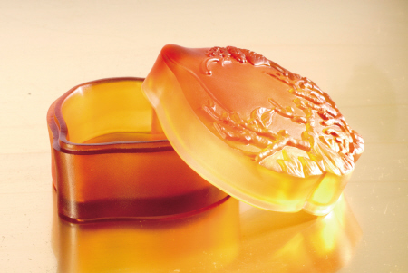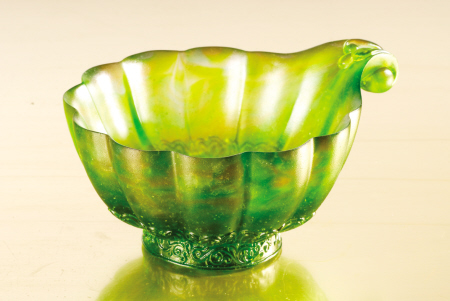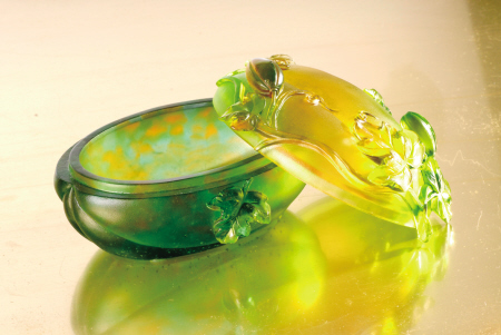 “蜜瓜丰秀饰盒”(图3) 器型上借鉴北京故宫博物院珍藏的清代琉璃器“黄地套绿玻璃瓜形盒”,分盒盖、盒底两部分,整体合龙后为一个扁圆甜瓜形器。瓜体在原型雕塑过程中应用玉雕中的阳雕技法,使覆饰、缠绕其上的藤蔓、枝叶、花苞和果实立体化地凸现出来,选用特定色彩的琉璃材质烧制后,通体呈半透明翠绿色,在光影的映照下,可隐隐透见不同的色彩层次,丰实饱满的瓜体及细部缀饰显得栩栩如生,触发一种清新自然的艺术之美和甜蜜圆满的心理感应。它在装点场景艺术氛围的同时,可收纳名贵首饰及项坠之类的饰品。