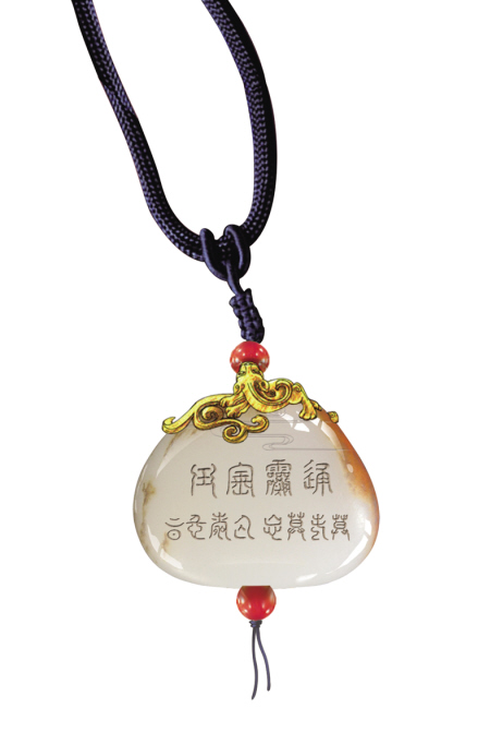 宝玉兼具玉石的质感、金属的光泽和琉璃的明透,正反面喷涂文字,搭配黄色的金属小饰件和喜庆的红色挂绳,给人以内外明澈、莹洁空灵的视觉美感和常保平安、福寿圆满的美好祝福。(通灵宝玉正面文字:通灵宝玉,莫失莫忘,仙寿恒昌;反面文字:一除邪祟、二疗冤疾、三知祸福。)