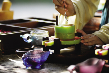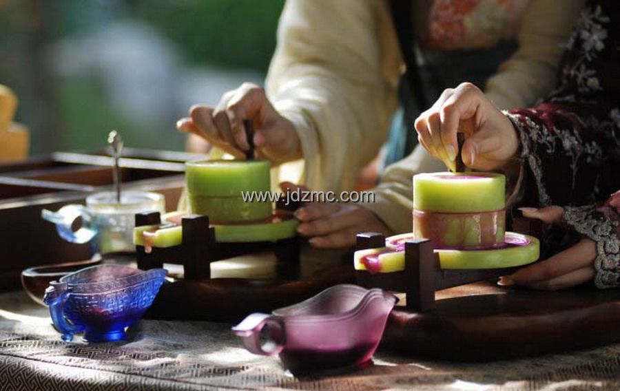 所谓“开辟鸿蒙,谁为情种?都只为风月情浓。”一个“情”字,凝成红楼几多情思与佳话。为配合剧情的推进和剧中女性角色命运的展开,研读中国历代情诗中托物言志的几大常用意象后,千玉琉璃最终确定以心形、蜜瓜、蜜桃等为主题元素设计创作了才子佳人的琉璃挂饰和饰物盒。