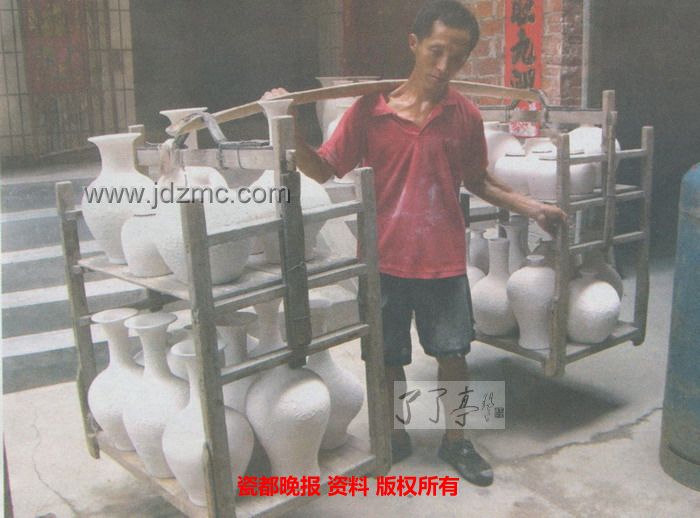 景德镇的夏天总是能“热”死活神仙,中午12时40分,灼热的阳光仿佛可以晒焦人一层皮,38岁的余长胜挑着一百五六十斤重的瓷胎回来了,仔细一数,他这副担子上竟然码了大大小小35个各式瓶子:有胆瓶、天球瓶、梅瓶以及大大小小的直口罐,这么多瓶子,几乎每种瓶子的形状都不一样,余长胜这一担从小康村到樊家并,差不多有1里路,他一口气没歇,一肩挑过来,一个瓶子也没伤善,这不得不说是个技术活。