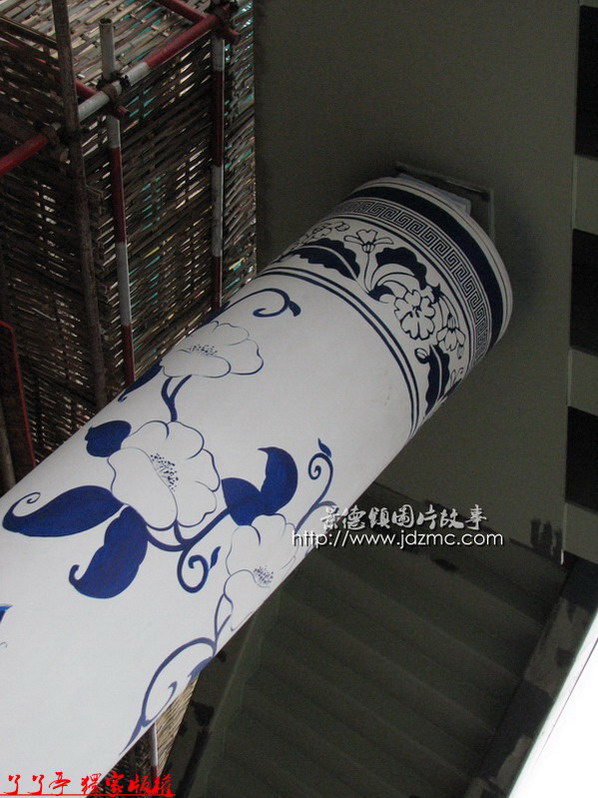 景德镇中心广场新修了一个过街天桥,底部的柱子采用了类似青花的图案装饰,颇有景德镇味。