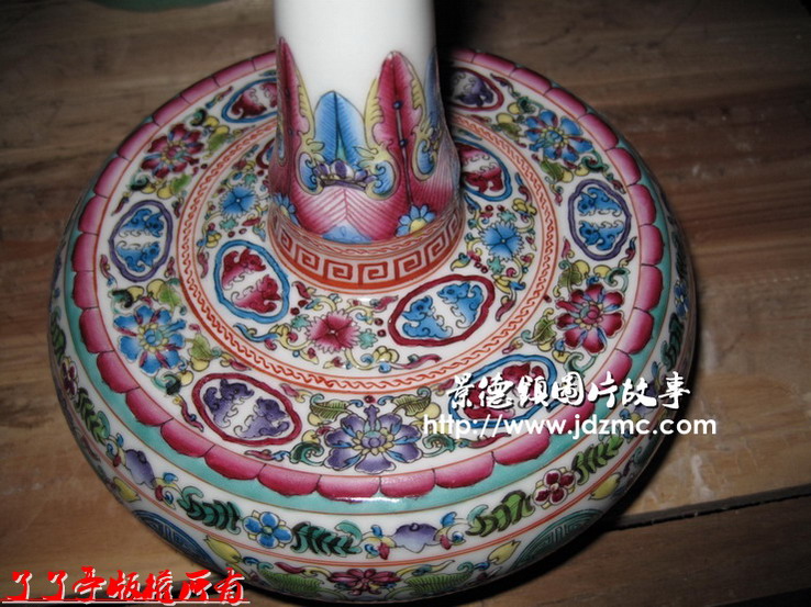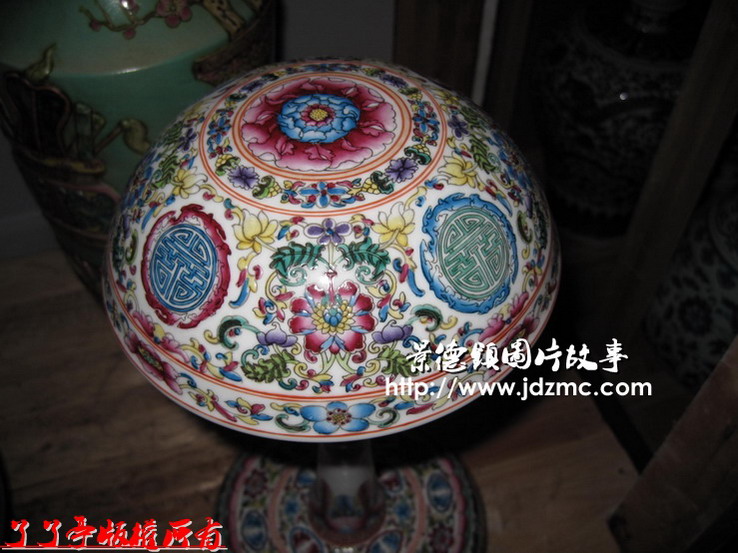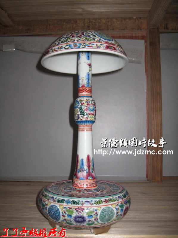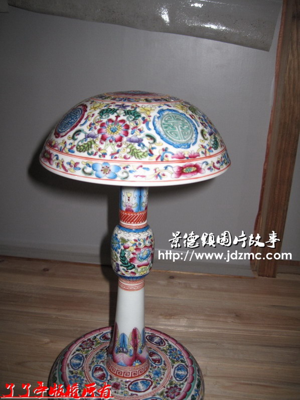 这个粉彩仿古的帽架,做工很精细。我只是很关心它应该是几个部位分开烧制的,只是最后是怎么烧结在一起的。我问了老板,老板告知,是一种特殊的粘结物质,在红炉烧制的过程中一起一次成型。