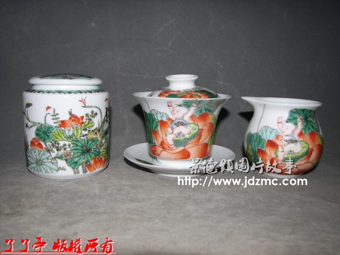 古彩作为茶具装饰的一种选择,无疑是正确的。它美在大红大绿,妙古色古香。