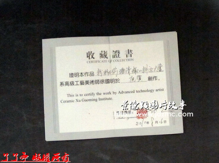 | 徐国明将了了亭收藏的精品制作成证书内容 | |||||