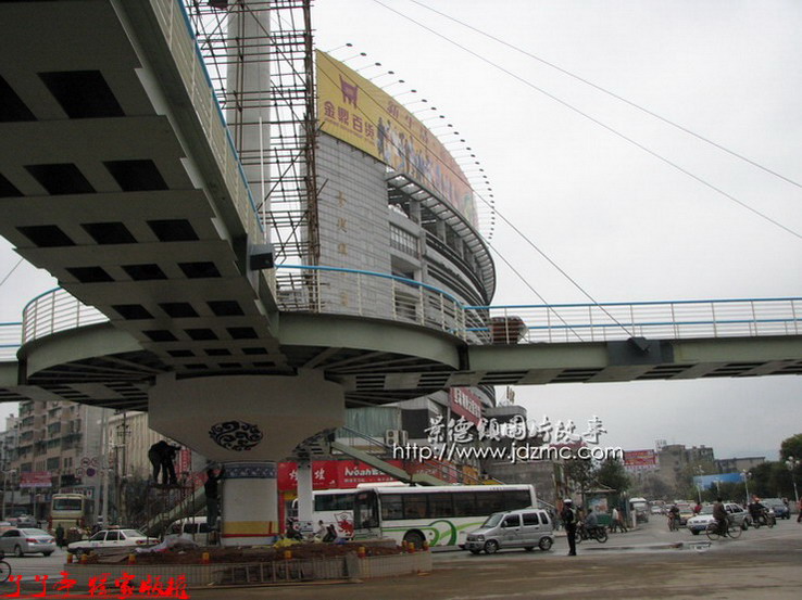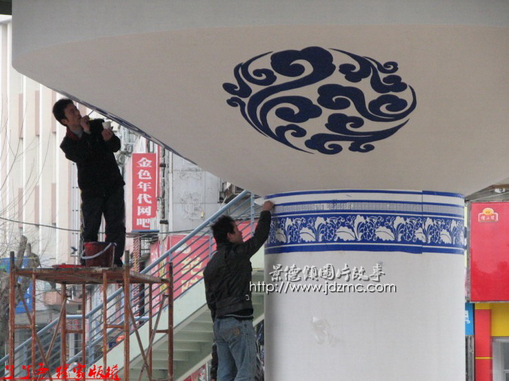 景德镇中心广场新修了一个过街天桥,底部的柱子采用了类似青花的图案装饰,颇有景德镇味。