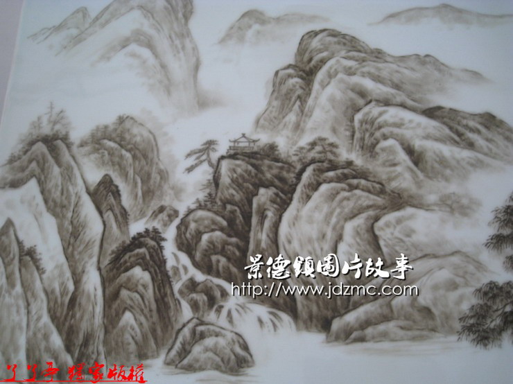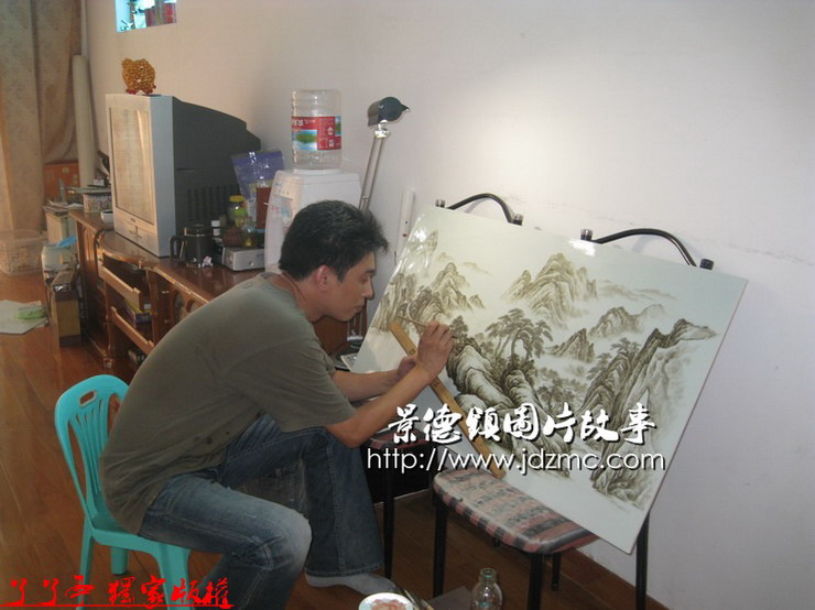 曾军是汪桂英儿子,擅长粉彩工笔山水,性格爽朗。昨天我陪同母亲一起到曾军家里做客,看见了他正在绘画的一件作品。