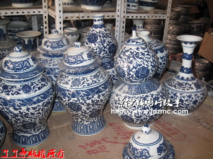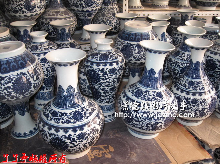 景德镇的贴花瓷器中多为100件的居多,价格也低的可怜。不过器形挺多的,尊、赏瓶、天球、蒜头、梅瓶、葫芦样样都有。