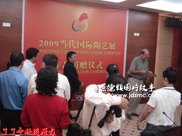 10月22日下午,景德镇市政府在紫晶宾馆会举办了2009当代国际陶艺展(景德镇)国内外艺术家代表向中国陶瓷博物馆捐赠作品仪式,出席捐赠仪式的嘉宾有景德镇市长李放、副市长黄康明及组委会的相关领导及工作人员,国内外当代陶瓷艺术家代表冯林、乔伊.斯图尔特.金维尔、周光真(美籍华人),芭芭拉.布朗、瑞克.斯文森等六位艺术家。