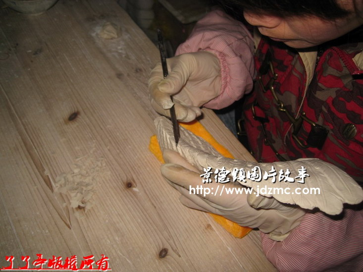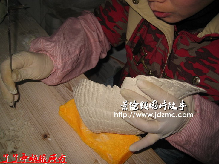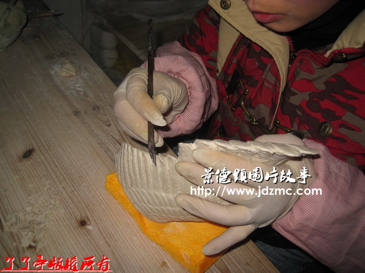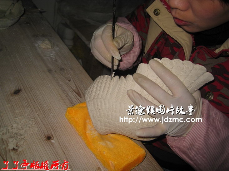 捏雕雄鹰的翅膀部分本身是模具出来的,但是绝大部分的细节需要经过手工雕饰而成。