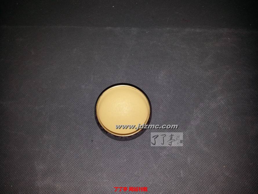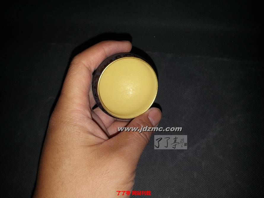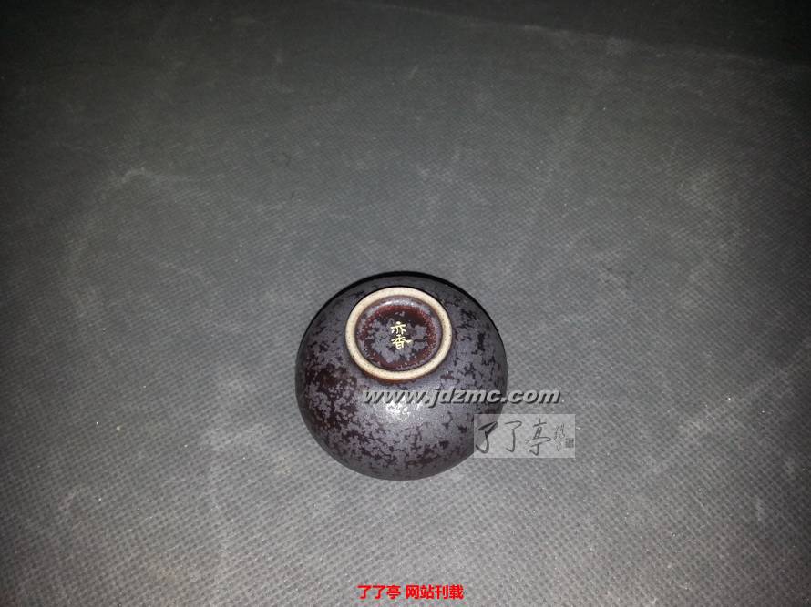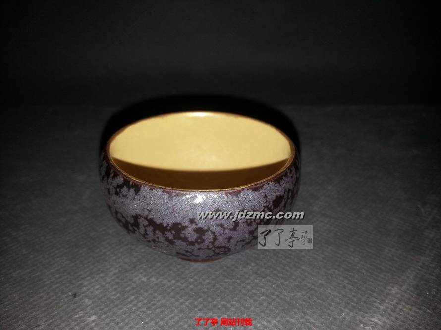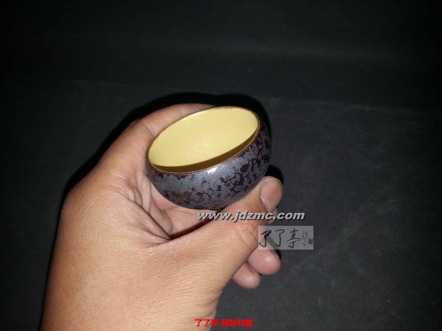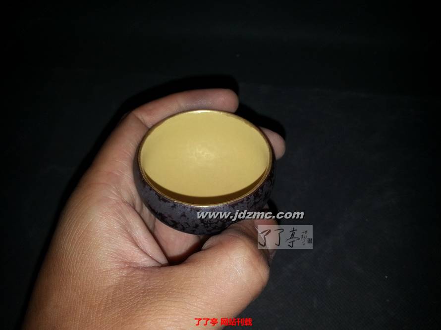 这个拇指大小的小杯里面镶上了两克多纯本金金粉,杯子是我做的,镶金是请徐国明老师完成的。外面是铸铁釉。