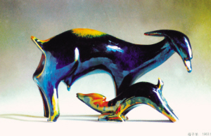 答:我从小就和鸡、鸭、狗共同生活,对动物有一份特殊的感情。记忆最深的是15岁那年,我在师范学院念书,著名美术家周轻鼎来做报告。他在巴黎学艺取得的成绩,令我羡慕不已。1954年,中央美院雕塑系毕业后,我放弃留校任教的机会来到景德镇,凑巧又遇上了周轻鼎。周老师提倡到生活中寻找艺术题材,对动物更是万般喜爱,做了不少动物雕塑。我跟着他,每天提着放满泥巴的箱子去农村写生,看到猪就塑猪,看到牛就做牛,打下了扎实的写生基础。我也萌发了要像老师一样专攻动物雕塑的愿望。后来,周轻鼎老师在浙江美院任教,上海动物园聘请他做动物雕塑,他邀我当助手。我多次到上海动物园写生,最长的一次,整整8个月吃住在动物园。以前我只接触家畜,这回接触到了各类动物,包括野兽,它们的体态、动作、性格深深烙在我的脑海,闭着眼也能画出来。动物形体、性格千姿百态,颜色更是丰富多彩,借助高温颜色釉、窑变釉等纹理效果,会产生意想不到的艺术魅力。我决定全身心投入到动物雕塑的创作上去。