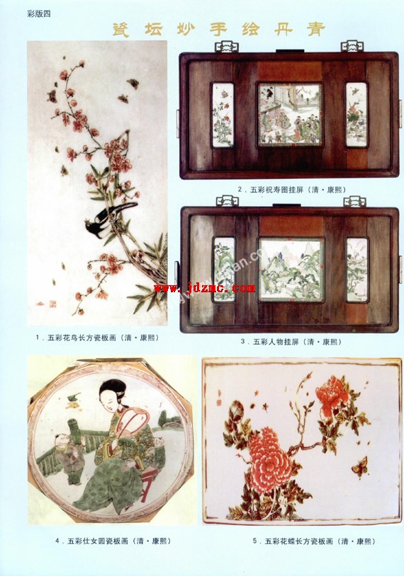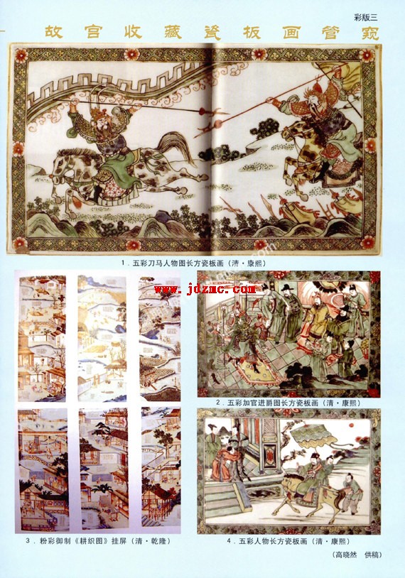 瓷板画除了摹古之外,有了更大的创新,多见有人物、山水及各种植物花卉、各式祥瑞吉庆、美意延年内容的图案,纹饰布局富丽繁密,多层图案,工整细腻,排列整齐,有图案画效果。纹饰画法与当时的其他瓷器完全一样,甚至更为精细,绝大多数瓷板画的绘画水平都达到了官窑器的水平。如乾隆粉彩御制《耕织图》挂屏(彩版三,3),现存共六屏。通体描绘了耕织场景。由于在同一视面上,为了画面的协调美观,各种耕织场面以田院或屋院落墙垣为图界,从而有序连贯地表现出众多的耕织场景。六幅挂屏画面描绘有耕图十四幅,织图十三幅。 耕织图始于唐代,至南宋娄绘成《耕织图》进呈,始有此名。清康熙时,命院臣焦秉贞绘成耕图、织图各二十三幅进呈,于康熙三十五年刻印颁行,是为康熙御制《耕织全图》,此亦为清代各帝所颁《耕织图》之祖本。以此挂屏现有的数目和表现内容来看,乾隆粉彩御制《耕织图》挂屏应为十屏,耕、织图各五屏绘就。 乾隆时期制瓷业的兴盛与此时的督陶官唐英是不无关系的,唐英于雍正六年(1728年)至景德镇,协理窑务,他从对于制瓷知识一无所知,通过刻苦钻研,至“虽不敢谓全知,颇有得于抽添变通之道。”(唐英著《陶人心语》),在他督陶期间,亲自参与了工艺制作,传世品中有许多写有唐英款识的器物,以笔筒为多,一般釉面上书有其诗书,他在瓷器上所书的款识现可考的除唐英外尚有“俊公、俊公氏、隽公、蜗寄、蜗寄老人、陶成居士、沐斋、陶铸、榷陶、陶榷使者、甄陶、陶成堂、陶人等”。故宫藏有一件冬青釉隶书“朱文公家训”瓷板,高26.5厘米,宽敞1厘米。冬青釉为地,上有墨书“朱文公家训”全文为:“父之所贵者,慈也。子之所贵者,孝也。君子所贵者,仁也。臣子所贵者,忠也。兄之所贵者,友也。弟之所贵者,恭也。夫之所贵者,和也。妇之所贵者,柔也。事师长贵乎礼也,交朋友贵乎信也。见老者,敬之;见幼者,爱之。有德者,年虽下于我,我必尊之;不肖者,年虽高于我,我必远之。慎勿谈人之短,切莫矜己之长。仇者以义解之,怨者以直报之,随遇而安之。人有小过,含容而忍之;人有大过,以理而谕之。勿以善小而不为,勿以恶小而为之。人有恶,则掩之;人有善,则扬之。处世无私仇,治家无私法。勿损人而利己,勿妒贤而嫉能。勿称忿而报横逆,勿非礼而害物命。见不义之财勿取,遇合理之事则从。诗书不可不读,礼义不可不知。子孙不可不教,僮仆不可不恤。守我之分者,理也;听我之命者,天也。人能如是,天必相之。此乃日用常行之道,若衣服之于身体,饮食之于口腹,不可一日无也,可不谨哉!”下首书“沈阳后学蜗寄唐英敬录”。 朱公即朱熹(1130~1200年),字元晦,后改字仲晦,别号紫阳,又号晦庵。祖籍徽州婺源(今属江西)。是南宋时期著名的思想家、教育家,宋代集理学之大成者,也是宋以后一位重要的哲学家、影响深远的教育思想家。朱熹生平著述之富,古今鲜匹。清朝全祖望称他“致广大、尽精微,综罗百代矣”。康熙皇帝称朱熹为“集大成而绪千百年绝传之学,开愚蒙而立亿万世一定之规”,足见其地位之隆崇。朱熹《家训》从“慈、教、孝、友、恭、和、柔”诸方面对父子、兄弟、夫妻之间伦理道德关系做了重要论述,指出每个人在家庭中应尽的道德责任和相应的角色义务,构建了彼此关怀、相亲和睦的理想家庭图景。这些合理的思想在长期的社会实践中,对维护和巩固家庭关系发挥了重要作用。在今天,对我们每个家庭都具有十分重要的指导意义。 在瓷板上书法或是绘画,虽然同是润滑的瓷质,但由于板面平整,较之在弧度较大的瓶、罐上绘画,更能随心所欲,展示超凡的绘画功力,其耐久性又非纸绢材料所能比,加之清康熙、乾隆时期的瓷器原料淘洗得非常细腻,胎质致密坚硬,在一定程度上增加了瓷板的坚固稳定性。这些镶嵌用的瓷板,其主体家具由于年代久远,可能早已腐烂损毁,但遗存下来的瓷板画仍旧历久弥新,光鲜如初,其浓郁的风俗色彩更为我们研究当时绚烂的“浮世”生活提供了不可多得的实物资料 本文择选几幅康熙时期瓷板画,与同好者共赏。 五彩刀马人物图长方瓷板画(彩版三,1),长25.2厘米,宽19.5厘米,厚3.5厘米。呈长方形,中空,侧面无釉涩胎,两侧对称分别有长方形插孔和椭圆形插孔,正反两面均以五彩为饰,四边有绿地锦纹装饰带环绕,中间点缀红朵花。瓷板正面绘有反映战争中两军对峙场面的“刀马人”图案,两员大将身披盔甲骑马鏖战于长城脚下,远处山石之后,可见旌旗招展,表现出战争的激烈场面;反面绘博古图,有瓶、鼎炉、琴、棋、书、画、银锭、笔架等杂宝。画面运用红、黄、绿、赭、黑等色彩描绘人物、景致,用色讲究,画工精到。康熙五彩中的战争场面屡见不鲜,一般多绘制在大瓶、大盘上,所绘人物的多少视器物画面空间所定,清人陈浏按其所见曾提到“康雍大盘,直径三尺,强彩画左传五霸战争之事,两阵有多至二百余人者,……。{3}” 五彩加官进爵图长方瓷板画(彩版三,2),长25厘米,宽18.6厘米,厚3.5厘米。瓷板长方形,空心;侧面无釉涩胎,两侧对称分别有两长方形插孔和椭圆形插孔。瓷板边饰为绿彩锦地纹,中间点缀红色朵花;瓷板正面五彩饰十个人物,黄袍君主端坐在宝座之上,对面一员大将跪拜受封。两侧官员、武士姿态各异,面带喜色。瓷板反面五彩饰博古图。画面运用红、绿、黄彩,并以黑
