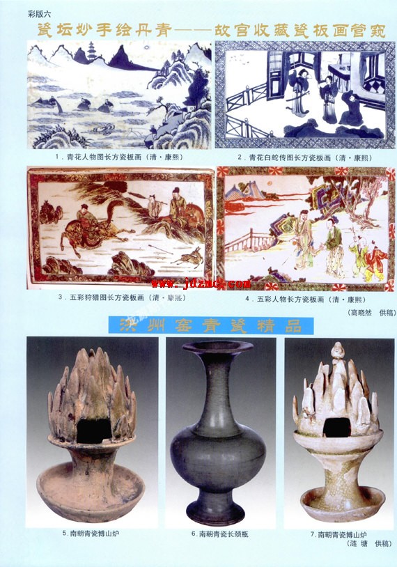 瓷板,是一种即可赏玩又能实用的装饰品,它是由最初的瓷质建筑用砖,慢慢演变为家具镶嵌和居室装饰之用。瓷板的制作成型难度较大,由于瓷土在烧结中会产生百分之十四左右的收缩率,烧制瓷板时须横放且垫以支烧工具,稍有不甚就会断裂曲斜。因此平面的瓷板比起烧造立体的器皿难度要大得多。考古资料表明,隋唐时期的瓷板是以墓志的形式出现{1},唐代越窑生产的八公分厚的青釉方形墓志,初步具备了瓷板的平面特征,但囿于成型工艺,墓志较小。明宣德年间景德镇御窑厂开始烧制用于建筑装饰的瓷砖,这种瓷砖具有一定的厚度和平整的板面特征,为瓷板的生产奠定了工艺基础。明嘉靖、万历时期,随着制瓷工艺与成型工艺的不断提高,瓷板除了以瓷砖的形式出现外,还在家具和文房用器上开始出现了少量的镶嵌瓷板,但大型瓷板的烧制在明代还有一定的难度。据文献记载,“万历十五、六年间,诏景德镇烧方筋屏风不成,变而为床,长六尺,高一尺可卧……{2}有清一朝,随着封建经济的繁荣,手工业快速发展,社会上产生了一大批新兴的富商巨贾阶级,他们在生活家居的布置上,日趋腐化奢靡,家具多采用镶嵌艺术,将不同的材料按设计好的图案,嵌入家具的表面。罗汉床和床塌的围栏及椅子靠背上有很多是采用装板镶嵌工艺,镶嵌的材料有大理石、玉石、螺钿、珐琅、陶瓷等等,色泽光闪明亮,璀璨华美,为清代的家具艺术增添了瑰丽的色彩。瓷板作为镶嵌家具中的一种材质,与其它材质相比较,色彩丰富,价格底廉,经久耐磨,在人们生活中广泛应用,并且远销欧亚各国(彩版二,1、2、5)。据康熙三十八年(1699年),来到江西的法国传教士殷弘绪在康熙五十一年(1712年)写给教会的信中写道“欧洲商贾,时向中国商贾订购瓷板之货,以为镶嵌桌椅之而成装饰——瓷板之长宽不超越一尺见方,如欲达其厚度,则只得以二片成上下使之中空,以成其厚度”。从故宫博物收藏的瓷板品种看,一类为瓷砖,一类为镶嵌瓷板。瓷砖收藏有六块,均为明代产品,其中四块为宣德青花锁锦纹瓷砖,均长27.9厘米,宽8.8厘米,厚2.2厘米(彩版二,3)。砖呈长方形,胎质细腻,正面装饰有规矩整齐的青花锁锦纹,图案布局严谨,美观大方。青花色泽鲜艳,深浅不一,色重处深入胎骨,呈现出点点的黑斑。瓷砖两侧及背面涩胎无釉,胎体光滑细腻略有少量的火石红,具有宣德青花器的典型特征。首都博物馆收藏有一件图案相同的青花瓷砖,砖为正方型。另有一件明嘉靖黄釉绿彩云龙纹瓷砖(彩版二,4),长28厘米,宽18.7厘米,厚4厘米。砖上窄下宽,以黄釉绿彩绘云龙戏珠纹,制作时先于素胎四周刻云纹,中间刻双龙戏珠纹,然后按纹饰所需填绿彩,低温烧成。此砖胎质粗糙,黄釉薄厚不匀,所绘双龙纹首尾相对,双目圆睁,如意鼻高耸,具有嘉靖朝龙纹的典型特征。还有一件明代珐花瓷板,正面以蓝釉为底,上以珐花彩绘关公骑马持刀像。人物形象刻划得极为生动。镶嵌用瓷板主要是集中在康熙与乾隆两朝,形式多样,装饰内容与传统瓷器上的纹样大体相同。 一. 康熙瓷板画 “世界之瓷,以吾华为最;吾华之瓷,以康雍为最。”康熙时期景德镇制瓷业达到鼎盛时期,官窑、民窑在相互竞争中共同发展。景德镇瓷器生产由于采取了减免赋税,“官搭民烧”和废除“匠籍”制等一系列举措,进一步扩大了生产规模,烧制技术普遍提高,精细瓷器不断涌现,器形丰富有棒槌瓶、胆瓶、玉壶春瓶、花觚、盖罐、盘、碗、绣墩、熏炉和瓷板等等,呈现出一派欣欣向荣的景象。瓷器上的装饰题材十分广泛,人物、动物、山水、花草、宗教、神话等等凡是可以描绘的事物,无一不用以作为陶瓷的装饰。其中不少题材反映了当时的社会生活的。由于明末清初时期,通俗小说、戏剧、版画的盛行,尤其是具有欣赏性的版画艺术,把小说、戏曲文学与版画三种艺术形式交汇在一起,深刻影响着康熙瓷器的装饰题材,在民窑瓷器中许多描绘当时流行的戏剧故事的装饰题材均来自于盛行的版画内容,如《西厢记》、《三娘教子》、《昭君出塞》等,充分体现了民间工匠借助戏曲艺术形式表现陶瓷艺术的功力。许之衡在《饮流斋说瓷》中说道:“人物故事标新立异,波澜推衍,穷极诙诡,大抵皆导源于小说稗官,然皆与历代丹青画法相合也”。“康熙画笔为清代冠,人物以陈老莲、肖尺木;山水似王石谷吴墨井;花卉似华秋岳,盖诸老规模沾溉远近故也”。可见画工们习得“丹青画法”,在绘画技法上达到了很高的水平,提高了装饰艺术的格调与品位。此时由于家具镶嵌的大量需求,彩绘瓷板的烧造步入了蓬勃发展的时期,故宫博物院收藏康熙瓷板画有青花、五彩、斗彩等品种,不仅数量多,而且器型、品种、纹饰都较之明代更加丰富多彩,除用于镶嵌家具等器物之外,更多镶于插屏、挂屏、多扇围屏上,为整个清代瓷板绘画的发展奠定了坚实的基础。 康熙瓷板画的造型有圆形、方形、长方形、六棱形,三角形,主要有两种形制:一种是空心瓷板,形如方盒,里中空,内以数道瓷条支撑,正反两面均绘有图案,主要装饰在硬木床榻的三面围栏上,使床榻内外都能看到图案,瓷板侧面有方孔或圆孔,可以与木床的接榫衔接。另一种是实心瓷板,只有一面图案装饰,另一面涩胎无釉,镶嵌在凹进的木框中,用于只需一面装饰的家具,也可以单独作为屏风、挂屏之用,摆放或悬挂于居室之中。 瓷板画面