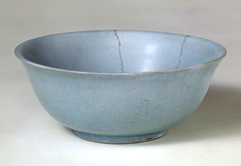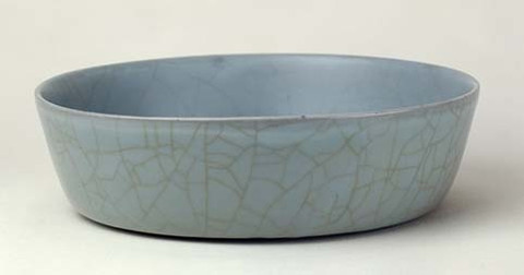 汝窑三足樽 【官瓷】官窑是宋代五大名窑之一,窑有南北之分。官窑釉厚者开大块冰裂纹,釉较薄者开小片,哥窑则以细碎的鱼子纹最为见长。