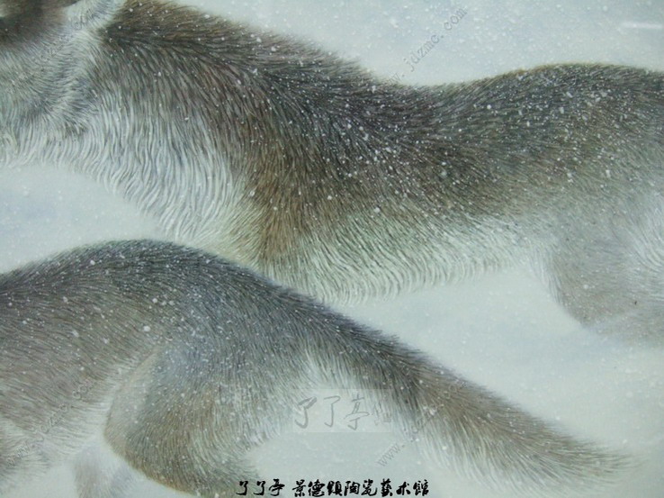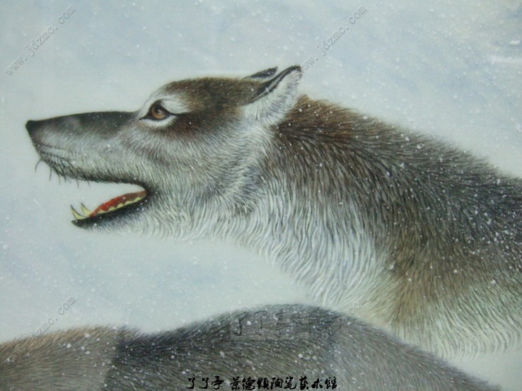 吴锦华介绍,《酣歌冲雪众志成》这种雪景动物画是陶瓷画领域的一个创新,它结合了粉彩与雪景彩两种工艺。同时在画中运用了拟人化的手法,对现实生活进行了寓意。