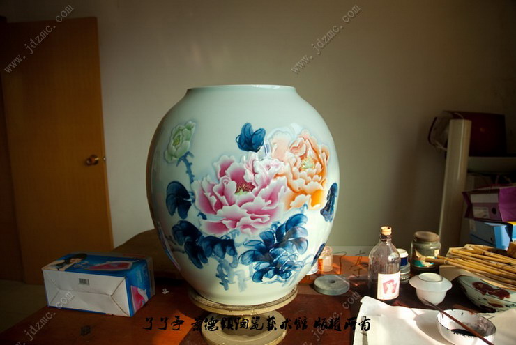 青花釉里红斗彩小口瓶《国色》,是个大型器件,高68厘米,直径7厘米,国色天香乃牡丹也,作者画了红黄绿三朵牡丹,青叶相衬,画面饱满,层次分明,尤其那黄色的和淡绿的花卉,都能采用分水技艺,色彩过渡,若明若暗,十分逼真,惹人喜爱。