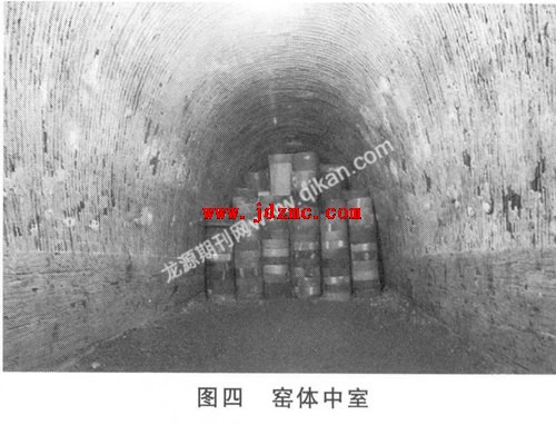 (1) 前室包括窑门和燃烧室,窑门为拱形门,作为进出坯料和成品的通道。在烧制过程中封闭,仅留观火孔和投柴孔。燃烧室平面为梯形,此处不能堆放器皿,是松柴燃料提高窑内温度的地方,事实上它与中室是一个整体,这里为了叙述方便按功能将其分开叙述。
