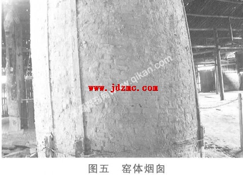 (3) 烟囱烟囱是排烟、通风的部分,窑顶尾部薄壁烟囱高出屋顶约7米,底部直径为Φ2.0米,壁厚仅80毫米,采用螺旋状砌筑,砌筑材料为窑砖。顶部作退台式钢笔尖形处理既全部掩盖了囱口竖向砖缝,防止雨淋,又融合了窑体前高后低建筑形式,有一定的装饰效果。囱体圈足较大,自重轻,倾斜眠砌,伸出屋顶经受风压的部分仅约6~7米,故相当稳固,无须特殊的基础处理和加固(图五)。