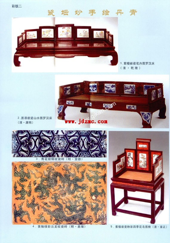 瓷板,是一种即可赏玩又能实用的装饰品,它是由最初的瓷质建筑用砖,慢慢演变为家具镶嵌和居室装饰之用。瓷板的制作成型难度较大,由于瓷土在烧结中会产生百分之十四左右的收缩率,烧制瓷板时须横放且垫以支烧工具,稍有不甚就会断裂曲斜。因此平面的瓷板比起烧造立体的器皿难度要大得多。考古资料表明,隋唐时期的瓷板是以墓志的形式出现{1},唐代越窑生产的八公分厚的青釉方形墓志,初步具备了瓷板的平面特征,但囿于成型工艺,墓志较小。明宣德年间景德镇御窑厂开始烧制用于建筑装饰的瓷砖,这种瓷砖具有一定的厚度和平整的板面特征,为瓷板的生产奠定了工艺基础。明嘉靖、万历时期,随着制瓷工艺与成型工艺的不断提高,瓷板除了以瓷砖的形式出现外,还在家具和文房用器上开始出现了少量的镶嵌瓷板,但大型瓷板的烧制在明代还有一定的难度。据文献记载,“万历十五、六年间,诏景德镇烧方筋屏风不成,变而为床,长六尺,高一尺可卧……{2}有清一朝,随着封建经济的繁荣,手工业快速发展,社会上产生了一大批新兴的富商巨贾阶级,他们在生活家居的布置上,日趋腐化奢靡,家具多采用镶嵌艺术,将不同的材料按设计好的图案,嵌入家具的表面。罗汉床和床塌的围栏及椅子靠背上有很多是采用装板镶嵌工艺,镶嵌的材料有大理石、玉石、螺钿、珐琅、陶瓷等等,色泽光闪明亮,璀璨华美,为清代的家具艺术增添了瑰丽的色彩。瓷板作为镶嵌家具中的一种材质,与其它材质相比较,色彩丰富,价格底廉,经久耐磨,在人们生活中广泛应用,并且远销欧亚各国(彩版二,1、2、5)。据康熙三十八年(1699年),来到江西的法国传教士殷弘绪在康熙五十一年(1712年)写给教会的信中写道“欧洲商贾,时向中国商贾订购瓷板之货,以为镶嵌桌椅之而成装饰——瓷板之长宽不超越一尺见方,如欲达其厚度,则只得以二片成上下使之中空,以成其厚度”。从故宫博物收藏的瓷板品种看,一类为瓷砖,一类为镶嵌瓷板。瓷砖收藏有六块,均为明代产品,其中四块为宣德青花锁锦纹瓷砖,均长27.9厘米,宽8.8厘米,厚2.2厘米(彩版二,3)。砖呈长方形,胎质细腻,正面装饰有规矩整齐的青花锁锦纹,图案布局严谨,美观大方。青花色泽鲜艳,深浅不一,色重处深入胎骨,呈现出点点的黑斑。瓷砖两侧及背面涩胎无釉,胎体光滑细腻略有少量的火石红,具有宣德青花器的典型特征。首都博物馆收藏有一件图案相同的青花瓷砖,砖为正方型。另有一件明嘉靖黄釉绿彩云龙纹瓷砖(彩版二,4),长28厘米,宽18.7厘米,厚4厘米。砖上窄下宽,以黄釉绿彩绘云龙戏珠纹,制作时先于素胎四周刻云纹,中间刻双龙戏珠纹,然后按纹饰所需填绿彩,低温烧成。此砖胎质粗糙,黄釉薄厚不匀,所绘双龙纹首尾相对,双目圆睁,如意鼻高耸,具有嘉靖朝龙纹的典型特征。还有一件明代珐花瓷板,正面以蓝釉为底,上以珐花彩绘关公骑马持刀像。人物形象刻划得极为生动。镶嵌用瓷板主要是集中在康熙与乾隆两朝,形式多样,装饰内容与传统瓷器上的纹样大体相同。