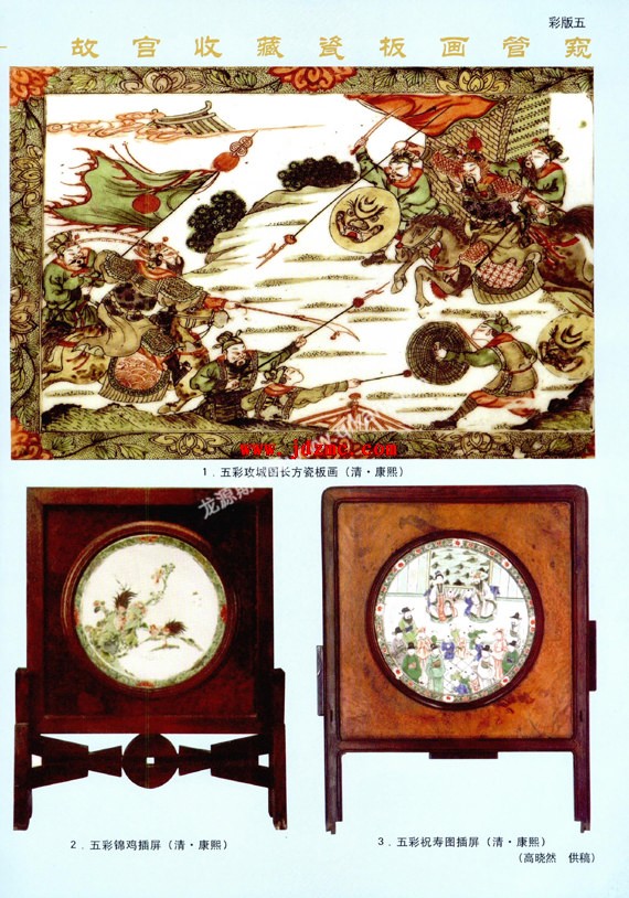 五彩攻城图长方瓷板画(彩版五,1),长25厘米,宽19.2厘米,厚3.5厘米。瓷板长方形,中空,侧面有插孔。两面均以绿地点纹,上饰等距的朵花为边饰,一面五彩绘攻城图,城门前两军将领身披盔甲骑在战马之上,手拿大刀、长戟迎面而战,两军士兵手持长枪、盾牌紧随其后。画面以黑彩勾勒人物、马匹、山石、屋顶、战旗轮廓,用平涂技法敷以红、绿、紫、黄、金等色彩,人物形象栩栩如生。康熙瓷器中有许多表现战争场面(俗称“刀马人”)的绘画,其流行与康熙帝倡导习武,“以不忘江山来之不易,不可好务享乐太平”的训导有关,画面上刻画出两军酣战、人马奔腾的紧张场面。这些图案大多出现于民窑器物上,文献中“一般戏曲故事,民窑为多”的记载。人物形象受明末清初人物画家陈老莲画派的影响,神态夸张,个性鲜明(缺图)。