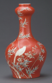 ■色料特点:每一图案均由多种色料调配而成。其料彩表面光滑有玻璃质反光感,有时还可反射蛤蜊光,十分美观。釉料均凸出底釉略高出一毫米左右,有明显的立体感,闭眼用手摸可明显感觉到,若用10倍放大镜看可在每一片小花、小叶上看到极小的开片纹。这一现象用肉眼看不出,这也是最重要的一个特征。而粉彩则感觉不到有凸出的情况。