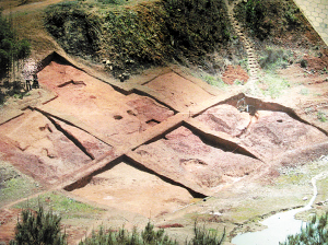 7条窑炉中,2号窑炉保存基本完整,分窑床与火膛两部分,通长8.7米,向上斜着趴在山坡上。炉址周围散落着大大小小、图案可见的青瓷碎片,有些地方瓷片堆积层厚达近两米,发掘出来,数以吨计。考古工作者尽可能拼接、复原破碎于2000年前的那些原始青瓷,发现有盆形鼎、盂形鼎、豆、盆、三足盆、盘、三足盘、镂孔长颈瓶和罍、尊等,同时还有仿青铜器的乐器,如甬钟、悬铃、悬鼓座、三足缶等。