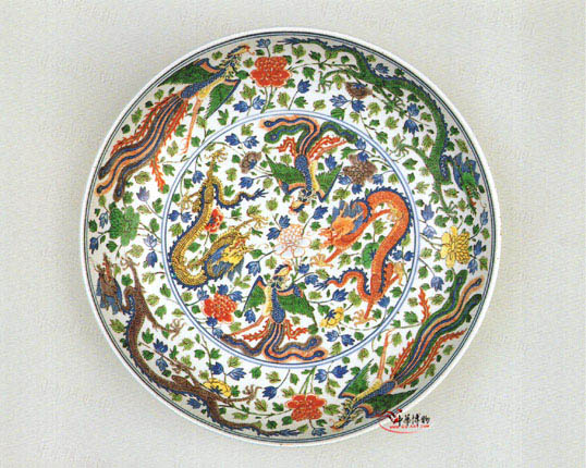 清康熙 景德镇窑五彩龙凤戏牡丹纹