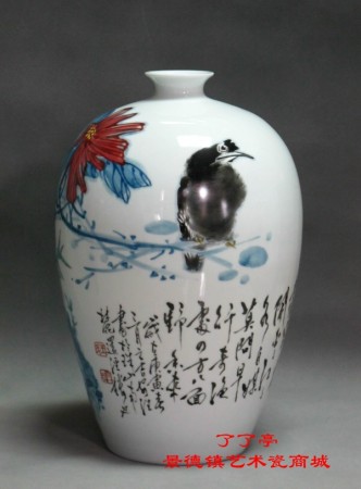 图为:《八哥》青花斗彩.王安维(陶瓷世家、陶瓷美术教授、清华大学访问学者.)