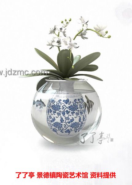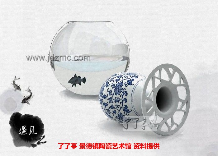 了了亭 景德镇陶瓷艺术馆 资讯:这是一个新中国风的设计作品,鱼和植物都是家庭里非常常见和很喜欢养的,这个设计结合了花瓶和鱼缸的功能,结合了传统青花瓷和现代感比较强的玻璃这两种元素。
