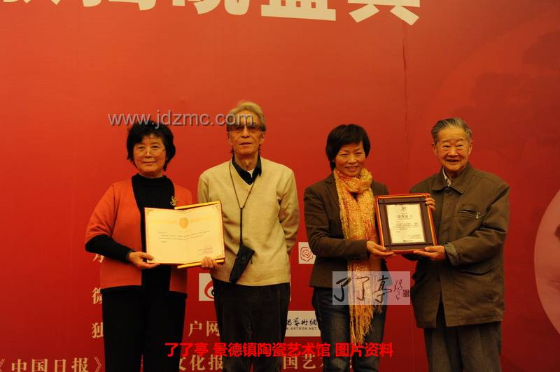 中国文物学会副会长罗哲文、中国艺术研究院原院长刘勃舒为程淑美、蔡玲玲创作的优秀工艺美术作品颁发证书.JPG