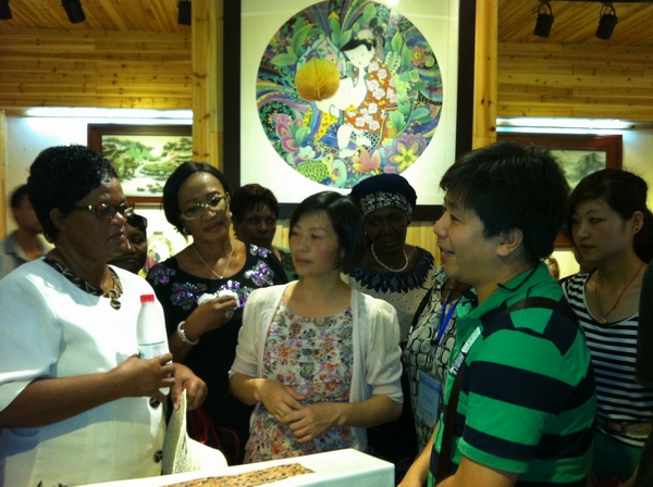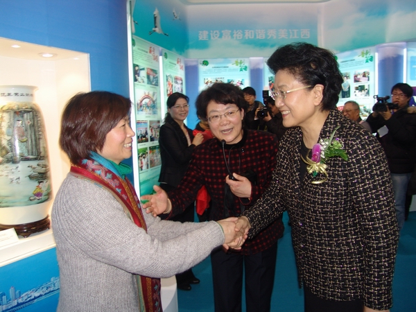 当然,蔡玲玲除了采风、设计、创作之外,她另一个光环就是在自己的艺术馆受到了全国妇联副主席陈秀蓉等一行的登门表彰。应该说,这是景德镇陶艺家的光荣与骄傲,更是对景德镇女陶艺家德艺双馨的肯定。2012年7月6日,来自非洲十多个国家政党女干部与全国妇联组织干部研修班代表一行40余人来到蔡玲玲艺术馆进行参观学习,在这里,她们感受到浓烈的陶瓷文化氛围,感受到了其作品散发出来的民族、民俗、民风的艺术韵味。通过她的现场绘瓷表演及讲解,大家一致认为她既是艺术家更是专家、学者,通过对她每幅作品的透析一致认为她是陶瓷文化的创造者和传承人。
