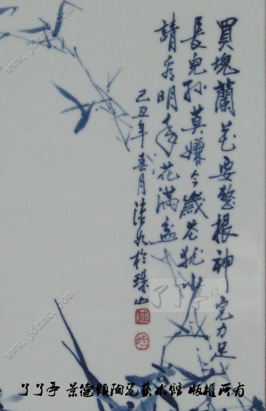 年尾30号的早上,母亲和陆如老师聊天,虽然今年危机来临,年景有些凉意,但了了亭定军景德镇后得到了景德镇报纸、杂志和电视台等诸多媒体真诚的肯定,艺术界、收藏界和景德镇政要也常来了了亭参观,对了了亭对当代艺术瓷行业的各项贡献给予了表扬。因为陆如老师价格每一年的1月1日的要照惯例周期性向上调整,母亲说,能不能就算我们报了个“到”,这几天安排个时间请陆如老师给一两件精的、完美的作品,陆如老师答应了母亲。于是从30号开始了漫长的等待,一直到今天早上,陆如老师终于安排出了时间邀请我们去看他的新作。一进屋,一块精神抖擞的“兰竹图”瓷板放在墙边,上书“买块兰花要整根,神完力足长儿孙,莫嫌今岁花犹少,请看明年花满盆。”这首诗恰如其分的形容了景德镇了了亭的存在,也在其中暗喻了陆如老师对了了亭的关心和祝愿,笔者也想通过这块瓷板的隐喻来祝福网友们”长儿孙,花满盆“。了了亭·李申盛/文