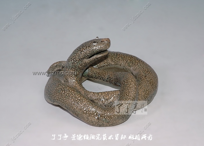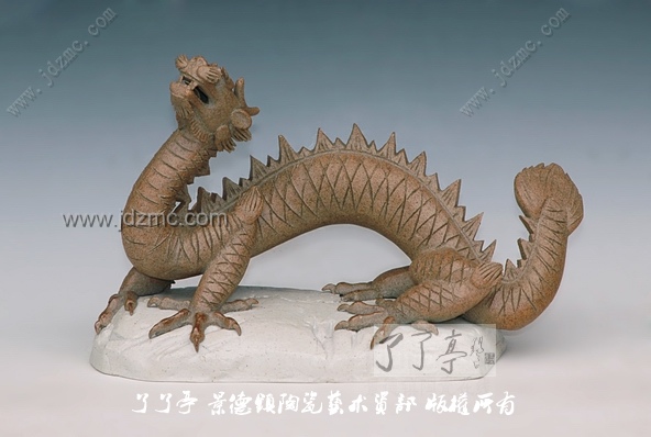 龙:龙是中华民族意气风发,奋发图强,蓬勃发展,不断向上的象征。中国人都以身为龙的传人而感到无比自豪,周国桢老师这件“龙”雕塑的创作是艺术性与文化性的高度统一和谐,含蓄体现中华精神又保证作品360度全方位的可看性,难度不小。龙是“镇四方,避不祥”的守护神,云台之上是一条腾龙,虽然鳞片表现仅仅只是简约的刀痕,但其极具冲击力的优美的龙形线条,无不打动观者的心扉。充满活力的神龙形象用了多种雕塑语言,形象比喻、抽象隐喻,多层次、多角度地完美阐述了这一主题。整个雕塑既有丰富的现代元素又有深沉的历史积淀感,现代和历史在此交融。正是对龙文化与中华传统精神的熟稔,以及身为龙的传人的周国桢教授才能设计如此传神。『了了亭·李申盛/文』 狗:周国桢这只小哈巴狗狗的质材是以白泥泥板成形,撒紫砂塑皮,两种不同熔点的陶瓷土相融相合,产生了真实而自然的毛质感。作品整体和周国桢教授表现是写意的,寥寥几笔捏雕,未刻意造型,却形神皆备。细部写实:鼻小巧,眼温驯,口微开,雕出一股灵气。最夸张的是尾部,大而蓬松,翻卷腾挪,令人忍俊不禁。如此可爱的小狗,恬淡安宁,笑意盈盈,是艺术家的心迹表露,也给观者带来温馨和快乐。『了了亭·李申盛/文』 蛇:人们对它是又敬又畏的。它能够在洪水到来时在水中游弋,其生殖能力很强,又具备毒性,很是凶猛。所以人们崇拜蛇,希望它带来雨水,带来谷物丰收和人口繁衍,还希望借助它的凶猛来驱除不祥之物。此件周国桢教授的手工蛇,不大,小巧,简单的盘曲,辅之特别肌理的高温色釉来表现蛇的肌肤,有着相当的质感,让人惊悚。蛇的盘曲绕缠,采用流畅豪放的手法,以及贴切的动势表现生动逼真的动物形体。即使是这样一件小型作品也十分具备了周国桢雕塑的特色。『了了亭·李申盛/文』 马:如果一件优秀的艺术作品是艺术之林中的一棵大树,那么,生活的祝福就是这棵树赖以根深叶茂的土壤。在这里我们不能不说到周国桢的过去,周国桢是一个从湖南农村走出来的教授,又主攻动物雕塑,自然而然的周国桢对于马的形与神,性格和表情早就谙熟于心了。体会这件雕塑,那披身汗血的郎红色釉,在高温窑火中还原丰富的釉面流动、挥发、肌理等,使得作品周身无不散发出一种强悍的美,张扬着一种力度和燃烧着的激情。这件作品体现了周国桢深厚的美学修养,它细腻含蓄,优美抒情,意境深邃,诗意盎然,是典型的洋溢着中国作风、中国气派的作品。『了了亭·李申盛/文』 猴:这件作品是周国桢教授具有独特材料语言的陶艺作品,在陶土素朴和原始的意味中,表现的是陶和瓷的“本质”和“本性”,并有意识地保留陶土的自然性质,力图在作品之中表现其质地效果。这只坐着的老猴子,双眼斜睨向天,似乎带着一丝笑,却是冷漠的。它仿佛在深思,目光有些深遂;又仿佛只是在闲看天外云卷云舒,人间的一切,都与它无关。它就那样,随意地坐着,时光于旁边匆匆流过。作品突出和强调了猴子的面部表情和大猴的“双手”,其余肢体只作虚略表现,加强了整体感,点化出了陶瓷材质的美学品格和文化内涵,这种追求使现代陶艺回到了形态意味的本原。『了了亭·李申盛/文』 兔:这个无釉泥板成形的兔子,我对它情有独中。它大大的脑袋椭圆形的,并且在额后方两只长长耳朵还露出红色的皮肤。椭圆形的脸蛋上镶嵌着一双似红宝石般的眼睛,不时发出耀眼的光芒挺刺眼的。在两眼中间较下方长着一突起的小鼻子,看起来并不明显,但周国桢老师还是用笔墨给点了点。兔子蹲着,四条小腿也看不清,只见短短的,那尾巴就更不用提了,只露出那一陀,不仔细的人还看不出来。整个身体如披上了一件用雪花做的皮袄,极其的漂亮!『了了亭·李申盛/文』 虎:在这只通体铁锈釉的老虎上,周国桢老师选择了老虎用锋利的前爪和张开的血盆大口来让人感受到动物的强大力量:老虎弓背曲蹲,力挥粗壮前肢,忿怒低头,一触即发的凶猛动态,展现出林中之王的猛兽剽悍性格。老虎的皮毛被高温单色釉加上些许刻画塑造的细致精美,纹理清晰竖立,无不暗示猛兽全身的强大力量正在沸腾,势不可挡。虎尾不时摆动,正在蓄积力量,欲跃未跃之时,开口咆哮,远山震动,大有虎啸风生之威。『了了亭·李申盛/文』 羊:周国桢教授的”泥条盘筑”的表现方法是与雕塑无穷加或无穷减的方法背道而驰的,也是对雕塑造型的一次革命。周国桢运用了夸张概括的手法,使泥的柔软性及手感效果在他的手中得到充分的发挥,长短、粗细、疏密的纵向泥条粘拼形成条形纹理,表现了绵羊的身体部分特点。由于盘筑时空间自然形成,又便于火的烧成。整件作品突出重点,强化了对象的基本特征,作品线条流畅,整体感强,很有气势。用盘条法表现中华民族艺术最具特色和最为经典的大写意,既不太具象又不太抽象,处于似与不似的最高艺术境界。『了了亭·李申盛/文』 鼠:老鼠的生肖一直都是艺术家比较难以发挥的种类,因为老鼠这家伙历史背景不好,而周国桢教师这老鼠,大耳朵、大肚子、咧着大嘴,露出两颗大门牙,通体裂纹片釉,将陶瓷瓶型装饰效果转嫁到生肖雕塑之上,有其独特的味道。老鼠浑圆可爱,圆耳后摆在脑袋上,小圆肚子饱 猪:猪,猪,猪,可爱的小猪,在景德镇瓷雕界实在是难得找到只可爱、憨厚让人爱不释手的小猪。而周国桢大师这只小猪