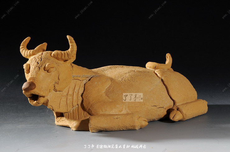 牛:不要以为那些裂纹是残缺和瑕疵,那才是周国桢特有的表现形式,也就他独一份。看!这头无釉泥板成形的老牛,膘肥身健,体型匀称,鬃毛整齐。它的头微微抬起,两只角弧形地往上弯,眼睛目不转睛地凝视着前方,它的尾巴不是一般地往下垂,而是往上伸,好像在拍打着身上的苍蝇和蚊子。它张开嘴,我仿佛听到了它那低沉的“哞哞”声。这一头横卧着的老牛,怎样表现它是横卧着的呢?周国桢的构思奇妙,让牛的前腿向后,右腿都向前,整个身子就像趴了下去。如此精巧!实在招人喜欢。『了了亭·李申盛/文』 |