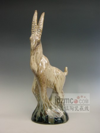细细审美这件领头羊作品,通体满施高温釉。釉色鲜艳明亮,釉质滋润,釉层肥厚光滑。雕塑线条流畅,比例匀称。其神情自若,悠闲自得。羊角向上扬起,并略弯曲;其皮毛在釉体的流动的反映下表现的又长又顺。另外,从侧面看,羊的鼻梁略有弯曲,额头隆起,下颏部有胡须表现加上短短的尾巴。确实将领头羊的神韵完成的非常到位。