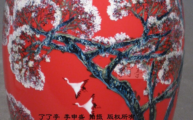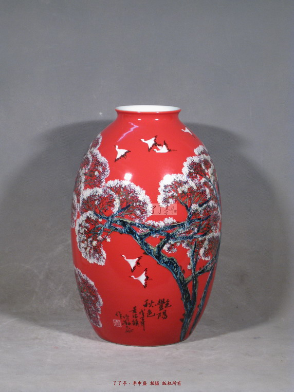 了了亭和宁勤征大师从第一件中华红走到今天已经过去了几年的历史,深感瓷器的红色,就应该是高温的红色,通过红色色料和釉面透明度的完美结合,反应出红色艺术之美。然而大红颜料不耐高温,这是陶瓷技术界多年来面临的难题。为开创艺术历史,宁勤征在研究陶瓷几十年来,也是一直渴望对红色瓷器装饰色料有突破,只是因为烧制艰难,其工艺方向常常迷失在历史的迷雾之中。而当历经艰辛的中华红高温色釉的新型红色陶瓷色料成功面世,并且在色彩上能够甚至某种特殊的窑火情况下其可能接近于纯正的亮红色。这种色泽鲜艳、表面纯净的亮红色的景德镇艺术陶瓷,成就了宁勤征国大师之路的基石。