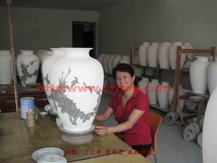 图中绘画的是秦胜照,另外的两位中一位是了了亭陈也君女士,还有一位是秦胜照的姐妹,她是秦胜照主要得力助手,负责坯的质量监控,更为重要的她是一位烧窑的高手。青花这东西离不开烧窑的高手,她们才是这个纪念瓷里面的幕后英雄。了了亭·李申盛/编写
