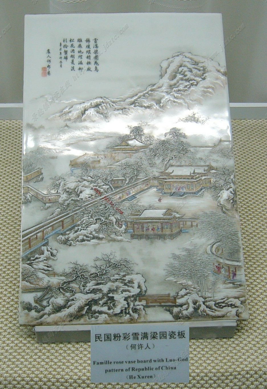 釉上彩的工笔画在陶瓷收藏界里面似乎有一个疑论,那就是工笔画好仿,因为它好仿,其艺术价值就不高。论点在理,在理的位置是艺术就要有自己的突出特点,其鲜明的特征不仅仅代表了一个艺术家对自己艺术人生的诠释,也是他一生的修为。同时这个鲜明的特征也在某种程度上为同时代或者后世来说是个仿制的门槛。但是论点也有不在理的地方,那就是工笔画其实不好仿制,就谈一个风景的工笔画,里面有很多种,如何许人他的功绩在于对景德镇陶瓷粉彩绘画雪景的完美表现,也更为注重了局部细腻的人物特写和楼阁等细微精绘,而他的弟子余文襄却注重立意,其雪景重意境而轻工笔;龚耀庭接了何许人的代,再往后的汪昆荣(立意)、凌宗正(立意),袁世文(工笔)等雪景画家皆各自不同,可是这么多年走过来,笔者怎么就没有发觉出一个能够画出,或者在民间找到仿制、超越出何许人、余文襄的作品。