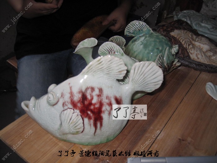 李德林,从小生活在农村,捉鱼捉虾,将童年的生活和回忆融入在这些陶瓷的鱼儿之中。最开始做鱼的是做最普通的鱼,鲶鱼、金鱼、鲑鱼,也是跟人们的生活中最为熟悉的鱼类。现在,进行了创意、变化、如,夸大面部,很在意鱼儿雕塑面部对观者的视觉冲击。并且在颜色釉的装饰上面也有自己的见解。因为每一条鱼都是手工制作,所以,需要对每一条鱼赋予不同的生命体征和思想理念。(了了亭·李申盛/文)