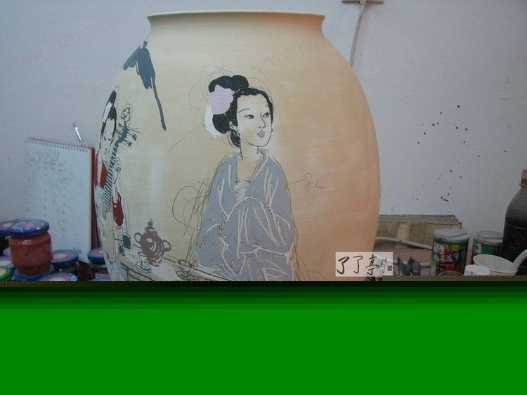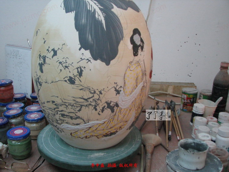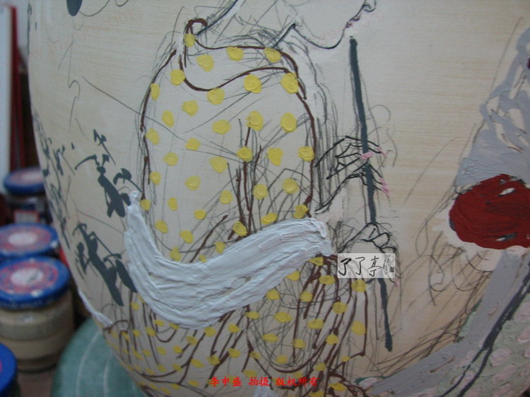 这两件150件的作品是李一新老师08年08月份创作出来的最新作品,为了体现实时播报的特色,笔者决定先将已经画好的作品的全局图片和细节局部拍摄出来,然后再等李一新老师将作品烧制完毕以后全景拍摄一遍。通过前期和成品的许多陶瓷成瓷的变化来展现出高温色釉的丰富的变化,和不可预知的危险。