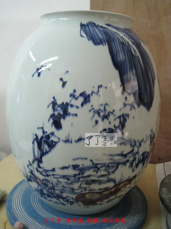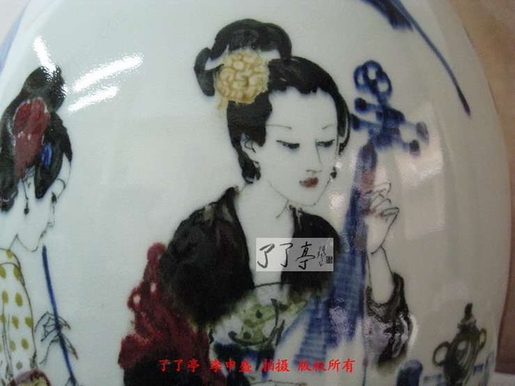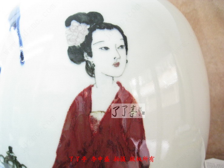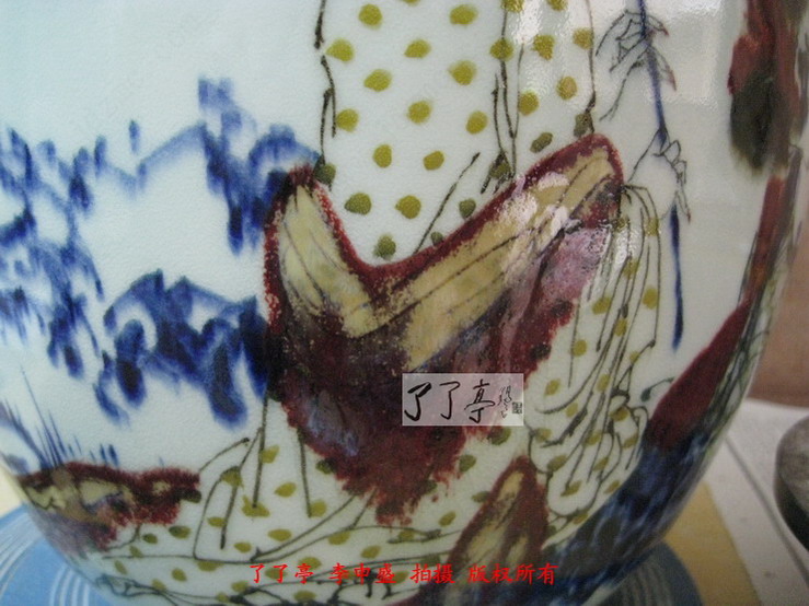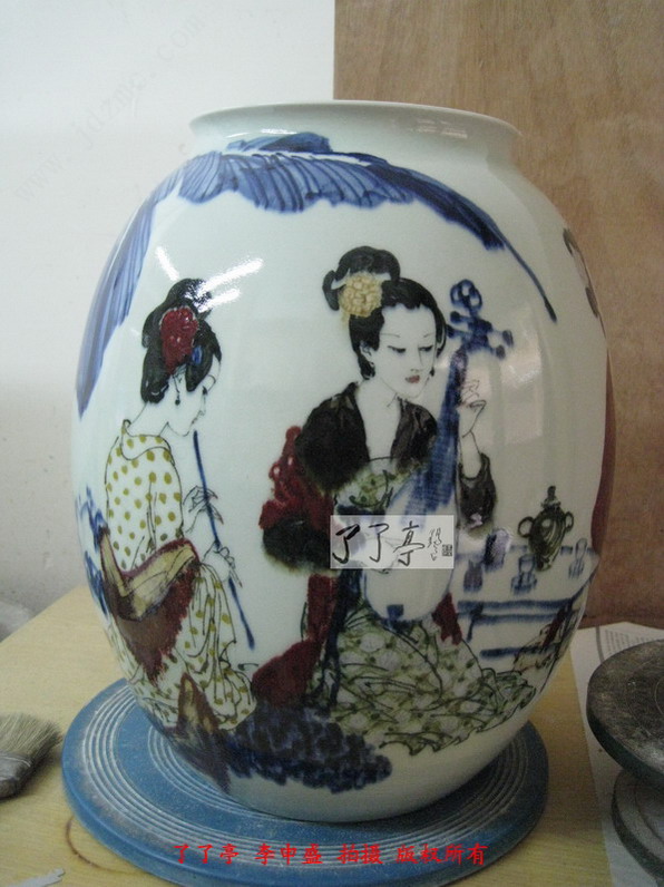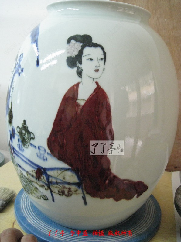 这一次的两件作品青花表现出了炸料的风格,同时高温色釉的各种颜色都烧制的非常鲜亮,这一点相信大家通过图片已经看得很清楚了。作品釉体用的比较软,这种相对较软的釉体给予了高温色釉一种非常中性的色彩表现效果,我们可以看到仕女画的一个局部的土黄点,李一新老师在装饰的过程中这一位仕女画面的衣饰完全采用了点状的表现模式,这些土黄点烧制的几近完美,清晰而艳丽。漂亮的绿色衣服纹饰,蓝而不俗的青花,透光性非常好的釉里红,将画面中仕女情感地诉求在色彩上尽情地流淌,给我们的视觉激荡与共鸣。了了亭李申盛认为时装是任何历史时段中女性绘画中不能不特别注意的地方,作画中仕女的衣饰恰恰才是故事的陈叙的亮点,它反应了画境的历史背景、人物的出处、以及更细腻的女性个性特征。而这些都是在泥巴坯上无法感知的,那是心中的色彩,是一种愈加灿烂丰厚,任它万千幻化世界,自在心中游刃有余。