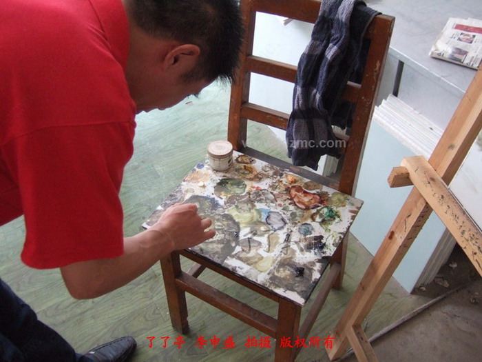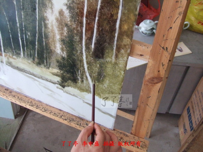今天在一家小铺门口我突然停留了下来,因为一副油画风格的陶瓷作品吸引了我的目光,我走了进去,看到作者(丁景生-职称:教师·钟莲生学生)正在全神贯注的绘制。具作者告知,这幅瓷板画是用新彩绘制,原型是油画森林大师“希施金”的作品,但是瓷板上只能感觉还原了60%的味道,并不是作者本人没有能力还原,而是作者自己到现在还没有控制住新彩色彩的调和后烧成色调。 就作者说,如果用肖像画的制作方式,新彩是完全能够100%还原油画的风格,但是因为新彩在瓷板上画油画的风格是不能用纯色系的,新彩的色料需要进行调和,而调和后的颜色目前作者还不能完全掌握,前面画的几块瓷板都因为烧窑后的色彩变化太大均告失败,仅侥幸成功了一块。因而作者目前还只是一种摸索的阶段。 笔者和他探讨的时候问询了一个问题:“一个新兴的表现手法固然给人赏心悦目的感觉,但是前面的路能不能走通,即使走通,市场又会如何评价还都是一个未知数,作为探索者可能几年的心血都会白白浪费,不知道您作何感想?”丁景生看了看我,微笑了半天,回了我一句话;“行业里面需要有人先行,我来看看。”然后拿起了笔,继续全神贯注的绘画。了了亭·李申盛/播报