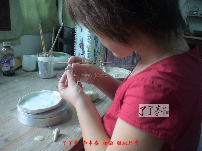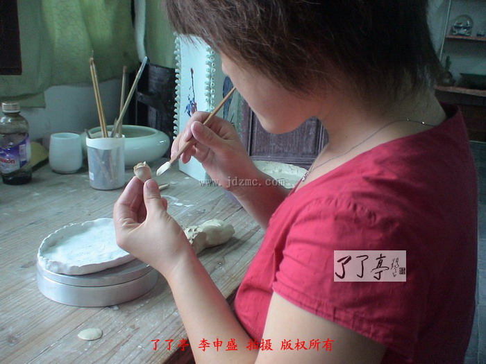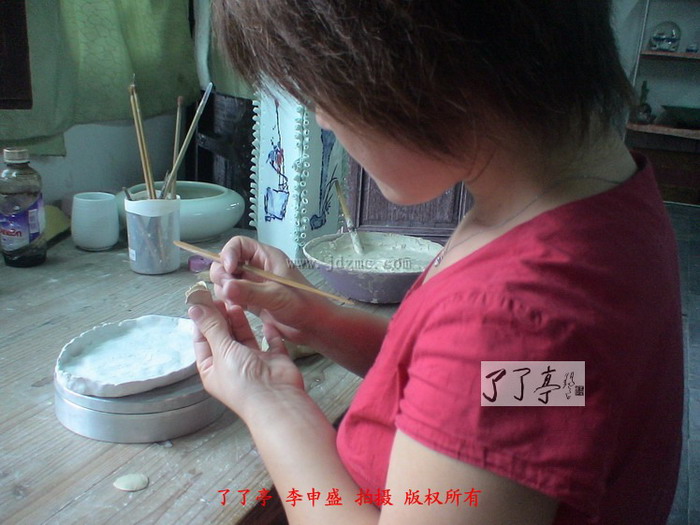 一直以为雕塑中的捏雕工艺并不复杂,也不繁琐,这种印象主要还是源于制作的人员众多,价格也不是很高。然而在今天我才明白捏雕所花费的功夫是如何巨大了,您可知道捏一朵花,复杂的花形至少要20分钟,一个作品上堆的那么多花朵常常需要花费几天的时间。再说一个您未必知道的内情,一朵捏雕菊花有400根菊花瓣,这个是有人亲自数过。您想想对于一个艺术家来说是多么复杂和艰巨的事情。我一直认为艺术没有高低,没有新旧,没有贫贵,没有白花齐放,就没有陶瓷艺术。 主讲人:王章清 高级工艺美术师,1972年出生于景德镇,毕业于江西省轻工业学院,在刘远长的工作室从事陶瓷创作工作。多年来,蒙承刘远长大师的悉心指点,使她的瓷雕作品无论是在工艺性上还是艺术性上都有了长足的进步。 近年来,有: “田园风情”、 “梦想成真”、“凌方”捏雕花盘及花饰系列均受到广泛赞誉。199了年11月,她参加了上海首届现代陶艺博览会的陶瓷文化交流,2001年11月应邀在上海全国商品交易会上进行景德镇陶瓷提雕的现场表演。2002年元月与陶院教授联合创作大型瓷雕壁画“百鸟朝凤”。