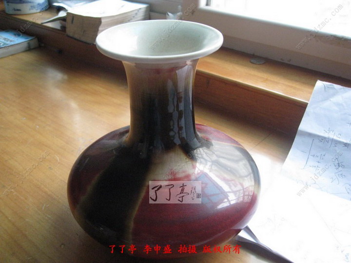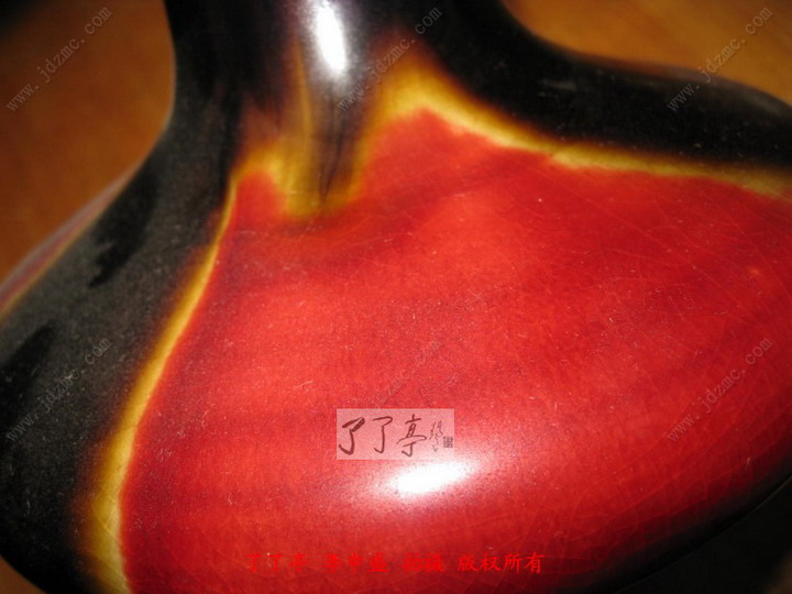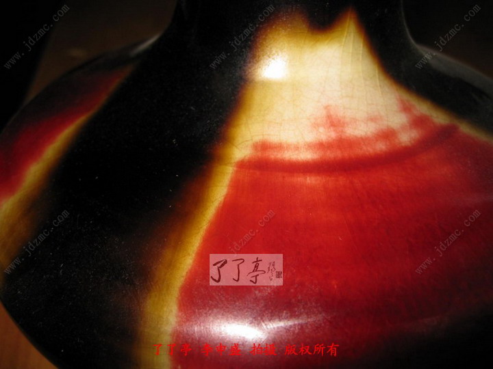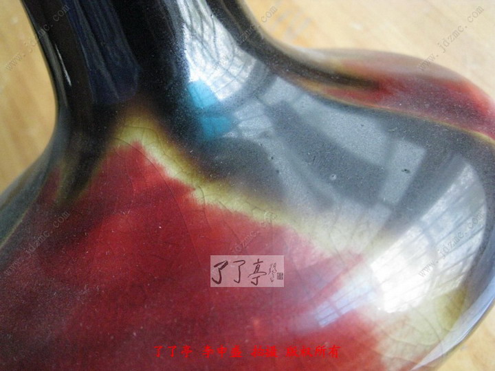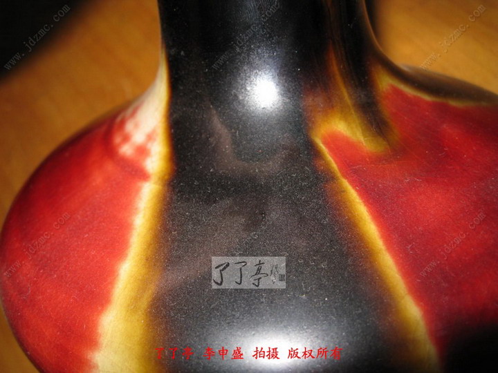 这是一个建国瓷厂的老三阳开泰的颜色釉陶瓷,根据持有人告知这件作品为柴窑烧制,我基本相信。但是笔者拿着这个瓷器反复端详,除了瓶子上油迹乎乎有些粘手以外,似乎还是难以找到多书中记载的柴窑和气窑的区别,我怎么看也不好分辨。所以干脆拍上图来让大家一起看看分别分别。笔者采用了两种拍照的模式,几张是没有加闪光的,几张是加了闪光的,以在不同的光源效果下给大家提供不同的审查角度。