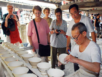 在国外,如果你跟别人说“我今天会去中国”,第三个人一定会说“是到景德镇去吧”。 文/图《瓷都晚报》记者青娈 在明清园看到一群老外与一个拉大板车的师傅交流,对景德镇人来说 正在变成一件寻常事。 “在国外,如果你跟别人说‘我今天会去中国’,第三个人一定说‘是到景德镇去吧’。”9月27日下午4时,景德镇乐天陶社董事长、英籍华人郑帏这样解释为什么越来越多的老外会选择到景德镇来的原因。 现在,在乐天陶社经常能看到一群做瓷器的老外。这些老外除了乐意在景德镇做瓷器外,还非常乐意走街串巷找裁缝店订做衣服,到夜宵摊吃夜宵,尽情享受在景德镇的生活…… 景德镇的奇妙之处 今年以来,已经有超过200个老外通过乐天陶社,来到景德镇,或学习陶瓷技艺或进行陶艺深造。其中有不少老外已经来过景德镇N次,包括加拿大数一数二的艺术家特鲁迪。 特鲁迪是加拿大红鹿学院的教授,第一次来景德镇是三年前,那时她受邀去上海的长寿公园做青铜雕塑,偶然遇到了郑炜。在郑讳的介绍下,她到景德镇呆了一周时间。 那次的景德镇之行给特鲁迪留下了深刻的印象,“因为在景德镇可以不受干扰专心做自己的事‘隋。而且北美没有使用电锄口工陶瓷的技术,加拿大也没有贴花纸的技术,但这些技术都可以在景德镇学到。” 这些新奇的技术最大程度刺激着特鲁迪的好奇心,而景德镇有近10万人从事陶瓷行业的事实,也让特鲁迪感到惊奇,“世界上没有哪个城市会像景德镇这样,有这么多人事同一种行业。”因为从业人员众多,整个产业很完善,各种资源相当齐备,给特鲁迪的创作提供了让她难以想像的便捷。基于这些原因,特鲁迪有了第二次还要来的打算。 去年暑假,当特鲁迪如愿来到景德镇时,她突然发现,自己居然被景德镇人记住了,走在路上,那些曾经与她打过交道的师傅会很热情地跟她打招呼,让特鲁迪备感亲切,“被人记住的感觉很好”。 这次来的时候,特鲁迪说:“有机会我要把我的学生也带到景德镇“。 年近六旬的苏妮娅来自印度,是抱着学习陶艺的想法来景德镇的,在此之前她是一位家庭主妇。经过几周的学习,苏妮娅进步很陕。9月26日晚,苏妮娅在乐天陶社学术研讨会上分享了自己的心得。 对苏妮娅来说,景德镇是一个很奇妙的城市,“在街上偶然遇到一个人,这个人都有可能出身于一个陶瓷世家,或者其身后的一大家子人都是做陶瓷这一行的,这真得很神奇。” 来自美国的DrydenWells给自己取了一个中文名叫“威龙”,2006年第一次来景德镇的时候他还是一个学生。从一本艺术杂志上看到景德镇后开始改变了自己的生活,威龙如今成了乐天陶社的一名员工,主要负责工作室的协调工作。在景德镇工作对威龙来说是一件当有意思的事情,“总是能看到不同的人,学习到很多东西。” 在美国,像威龙这样艺术专业毕业的学生,5年内很难找到一份称心如意的工作,所以这也成了威龙选择到景德镇来的原因之一。 当然选择来景德镇的老外有千万种理由,但郑棉一语道破天机:“因为景德镇是一个可以认真做陶瓷的地方。”爱好各不相同 杰西式来自美国,身高大概有1.9米,一般个头的人在他面前行走,有泰山压顶之感。让人没想到的是,人高马大的杰西式也有细腻的一面。最近一段时间,他每天下午3点都会准时出现在乐天陶社的工作室里,跟一位景德镇师傅学写毛笔字。 经过几周的练习,师傅觉得杰西式比上次来景德镇时进步多了,杰西式的毛笔字不仅有模有样,甚至比一些景德镇本地人还写得好。 杰西式在景德镇已经呆了有一年时间,他毕业于美国的一所陶瓷学院。经过在学校的系统学习,陶瓷工艺对杰西式来说已经不是问题了,他来景德镇完全是因为对中国文化的热爱。 杰西式喜欢将中美文化融入自己的作品,以至于他在景德镇创作的作品出现了—种奇怪的现象,“中国人认为很美国化,而美国则认为很中国化”。 杰西式的兴趣爱好很广泛,只要他感兴趣的东西都愿意去尝试,比如盲人按摩,这种完全按照人体经络操作的行为,在崇尚西医的美国人眼里是一种不可思议的东西,但杰西式却能接受,并“感觉很好”。只要有时间,杰西式都会来—次盲人按摩。 除了盲人按摩,杰西式还喜欢中国的八卦,以及过各种各样的中国节,比如端午、中秋等,了解这些节日的含义及内容。 与杰西式不同的是,特鲁迪更愿意跟一些老外朋友走街串巷找裁缝店订做衣服。 特鲁迪身高有1.8米多,这种体型要在景德镇买件合适的衣服是比较困难的事,于是只能订做衣服。 特鲁迪最喜欢去东门头一家裁缝店订做衣服,其中包括最具中国特色的旗袍;另外,新厂菜市场里的裁缝店也是特鲁迪等老外喜欢光顾的地方。特鲁迪身上穿的裤子就是在景德镇德镇订做的。 除了订做棚艮,特鲁迪还喜欢在每周一到国贸广场的古玩市场去淘宝。“虽然我知道有些东西并不是真正的古董,但我却乐在其中。”特鲁迪说。现在的生活对威龙来说有点单调,因为他正处于学习的喷涌状态,每天除了在自己的工作室里创作,基本上没什么个人的空间。不过,威龙很喜欢在景德镇的生活,他已经能够接受景德镇人偏辣的口味,有几次工作晚了,他还会跑到陶瓷学院附近的夜宵摊上吃点夜宵。 过中秋吃月饼听故事 9月26日下午2时,刚刚逛完古窑,来自澳大利亚的乔埃斯、芭芭拉、艾瑞和皮特意犹未尽,因为当天